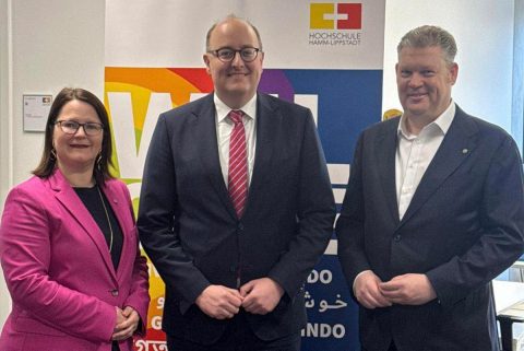 Matthias Hauer MdB besuchte den Campus Lippstadt der Hochschule Hamm-Lippstadt, um sich mit der Präsidentin Kira Kastell und dem örtlichen Landtagsabgeordenten Jörg Blöming auszutauschen.
