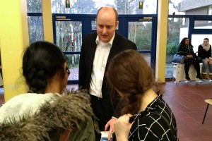 Zwei Mädchen tragen sich für eine der beiden Arbeitsgruppen bei Matthias Hauer ein, die er an der Gesamtschule Süd angeboten hat.