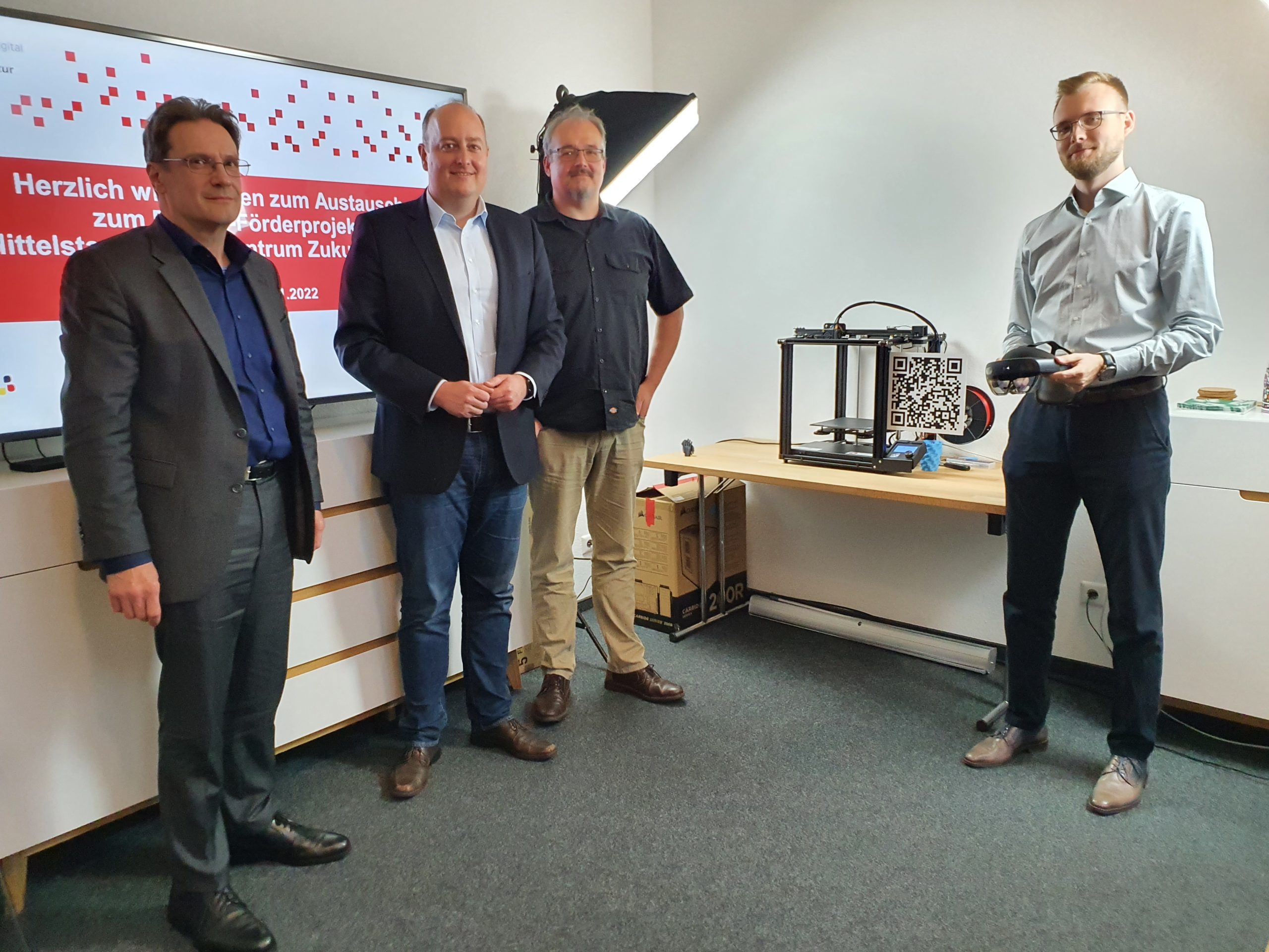 Matthias Hauer MdB mit Geschäftsführer Prof. Dr. Dominic Heutelbeck (Mitte), Projektleiter Holger Schneider (l.) und Student Damian Mavrudis (r.) im Transferlabor.