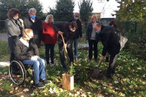Matthias Hauer MdB und Fabian Schrumpf MdL pflanzen Baumsetzlinge. Mit dabei: Dr.-Ing. Jasmin Janßen und Claus-Werner Genge (Wohnbau eG), Arndt Sauer (Leiter MGH) sowie kommunale Politiker.
