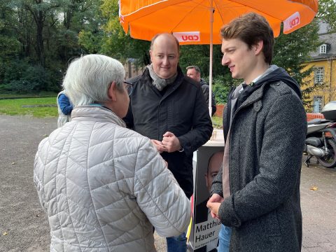 Matthias Hauer MdB und Ratsherr Yannick Lubisch beantworten die Fragen einer Bürgerin.