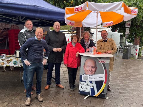 CDU-Bundestagsabgeordneter Matthias Hauer mit Ratsherr Dirk Kalweit, Bezirksbürgermeister Willi Kohlmann und weiteren engagierten Christdemokraten bei der Bürgersprechstunde in Kupferdreh.