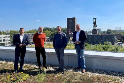 Vor dem geplanten Gelände: Florian Fuchs (CDU), Prof. Dr. Steffen Siegel und Thomas Seelig (v.l.n.r.) mit Matthias Hauer