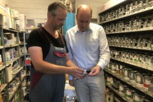 Marcus Wassyl zeigt Matthias Hauer, wie mit moderner Messtechnik die optimale Lackierfarbmischung für Fahrzeuge ermittelt werden kann. Der Karosseriebauer und Lackiermeister leitet die Werkstatt des Essener Familienbetriebs.
