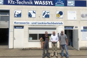 Matthias Hauer MdB und Ratsherr Theo Körber (rechts) mit Marcus Wassyl vor dem Karosserie- und Lackierfachbetrieb Kfz-Technik Wassyl in Altendorf