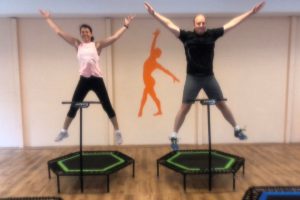 Hoch hinaus geht es für Matthias Hauer MdB und Studioinhaberin Cornelia Adamek mit einem Strecksprung auf dem Trampolin. Seit 2008 bietet das Studio Sportbegeisterten aus Werden und Umgebung individuelle Betreuung und qualifizierte Beratung.