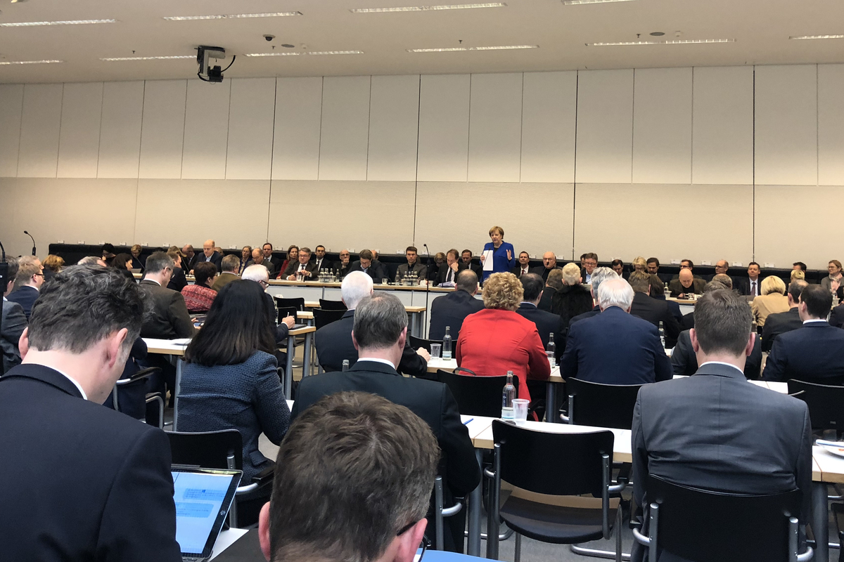 Angela Merkel berichtet der CDU/CSU-Bundestagsfraktion von den Ergebnissen der Sondierungsgespräche mit der SPD.