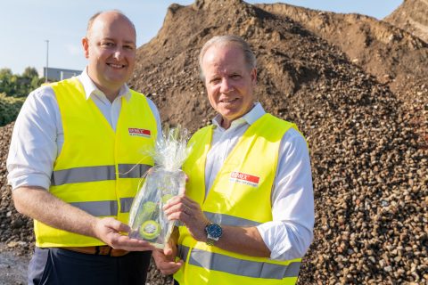 Matthias Hauer MdB bekommt von REMEX-Geschäftsführer Michael Stoll (r.) die „Recycling bewahrt“-Illustration überreicht: Der Aufsteller zeigt in eindrucksvollen Zahlen, warum Recyclingbaustoffe unverzichtbar für die Umsetzung der Nachhaltigkeitsziele der deutschen Bauwirtschaft sind.