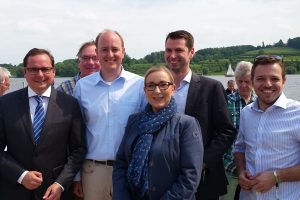 v.l.: Oberbürgermeister Thomas Kufen, Matthias Hauer MdB, Barbara Rörig, Fabian Schrumpf MdL und Florian Fuchs bei der Eröffnung der Badestelle am Baldeneysee