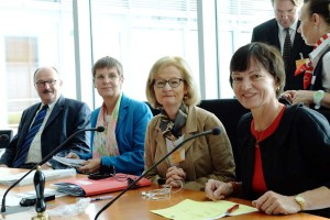 Dr. Elke König (2.v.l.), Präsidentin der Bundesanstalt für Finanzdienstleistungsaufsicht (BaFin), und Danièle Nouy (3.v.l.), Vorsitzende des Aufsichtsgremiums des bei der Europäischen Zentralbank angesiedelten einheitlichen Aufsichtsmechanismus SSM, sprechen im Finanzausschuss zum Thema „Bankenaufsicht“. Links: Parlamentarischer Staatssekretär Dr. Michael Meister (CDU/CSU), rechts: Ausschussvorsitzende Ingrid Arndt-Brauer (SPD).