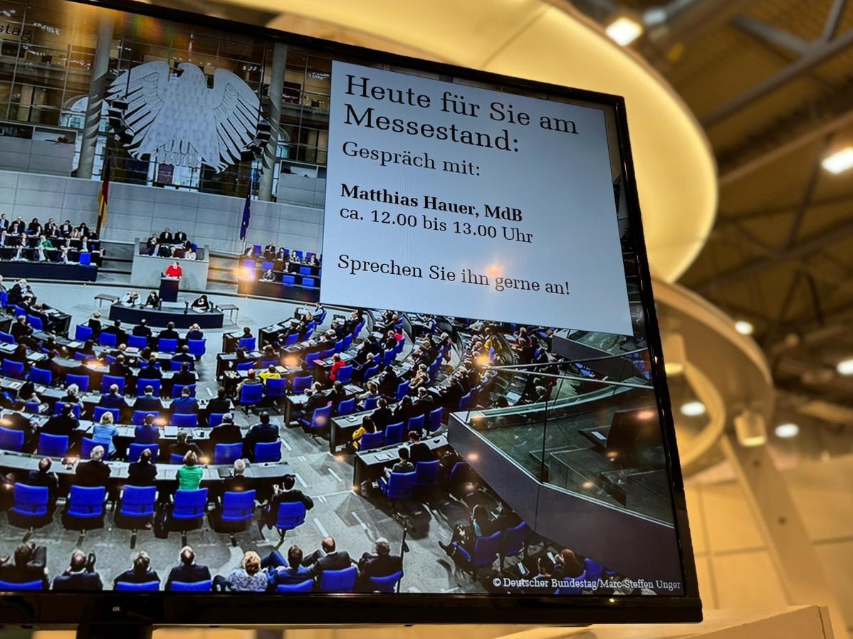 Hinweis auf die Bürgersprechstunde mit Matthias Hauer MdB am Messestand der Messe Mode Heim Handwerk in Essen.