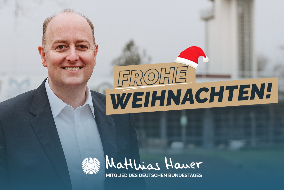 Ihnen und Ihren Familien wünscht Matthias Hauer MdB von Herzen gesegnete und friedliche Weihnachtstage – mit Zeit für das, was im Alltag oft zu kurz kommt: Ruhe, gute Gespräche und Momente, die Kraft geben. Gerade zum Jahresende tut es gut, innezuhalten, zurückzublicken und dankbar zu sein – für Zusammenhalt, Unterstützung und das Engagement so vieler Menschen in unserem Land. Matthias Hauer hofft, Sie können die kommenden Tage nutzen, um neue Energie zu sammeln. Für das neue Jahr wünscht er Ihnen Gesundheit, Zuversicht und viele gute Begegnungen.