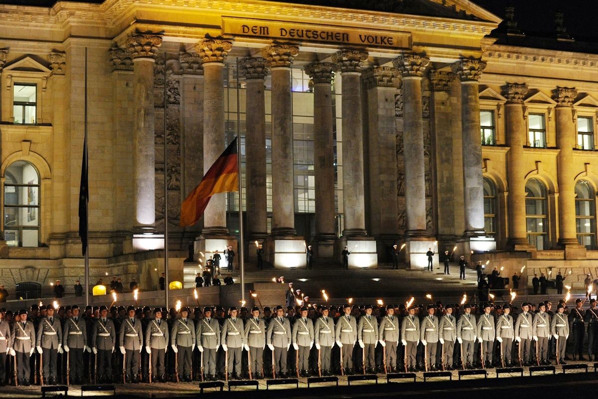 Mit einem Großen Zapfenstreich hat die Bundeswehr am Vorabend ihres Jubiläums vor dem Reichstagsgebäude ihr 60-jähriges Bestehen gefeiert. Am 12. November 1955 wurde sie gegründet. Die Bundesministerin der Verteidigung, Dr. Ursula von der Leyen (CDU), und Bundestagspräsident Prof. Dr. Norbert Lammert (CDU) hielten die Festreden. Auch Bundespräsident Joachim Gauck war unter den Gästen. Der Große Zapfenstreich ist die höchste Form der militärischen Ehrenbezeugung, die nur zu besonderen Anlässen aufgeführt wird. „Wir feiern heute den 60. Geburtstag der Bundeswehr vor dem Deutschen Bundestag, dem Sitz unserer Volksvertretung, dem Herzstück unserer parlamentarischen Demokratie“, sagte die Verteidigungsministerin. „An keinem anderen Ort wird die Verbindung zwischen unserem Parlament und seiner Armee greifbarer als hier.“ Es kommt nur zu einem bewaffneten Einsatz der Bundeswehr, wenn