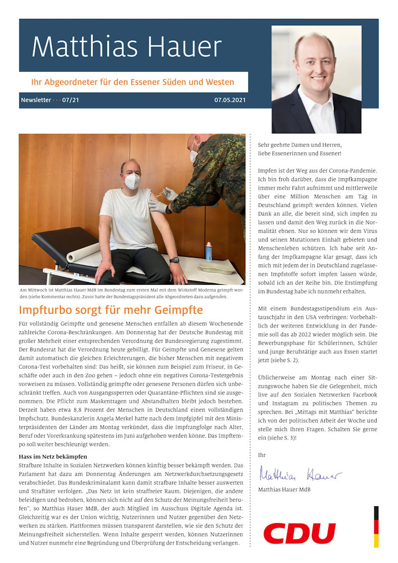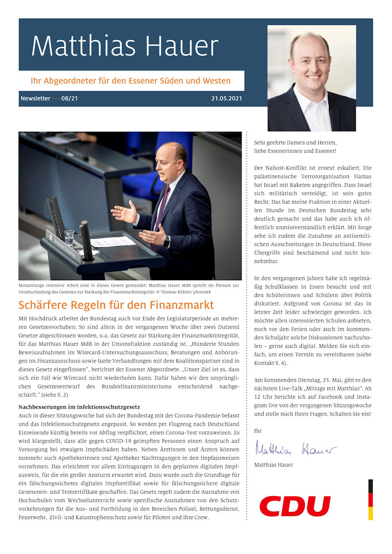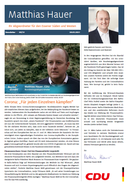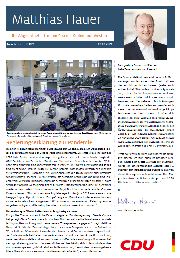 Sehr geehrte Damen und Herren, liebe Essenerinnen und Essener! In den vergangenen Wochen hat ein Skandal die Unionsfraktion getroffen: Ich bin schockiert darüber, wie Bundestagsabgeordnete augenscheinlich aus dem Mandat heraus mit der Pandemie Profit geschlagen haben. Das ist ein Schlag ins Gesicht der über 500.000 CDU– und CSU-Mitglieder und schadet dem Ansehen unserer Parteien sowie der Politik insgesamt. Ich bin froh über die sofortige klare Haltung der Parteien und der Unionsfraktion dazu. Wer korrupt ist, gehört in kein Parlament.