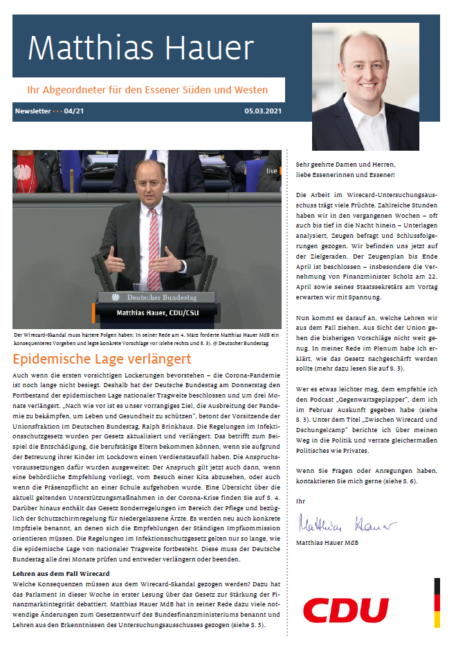 Sehr geehrte Damen und Herren, liebe Essenerinnen und Essener! Die Arbeit im Wirecard-Untersuchungsausschuss trägt viele Früchte. Zahlreiche Stunden haben wir in den vergangenen Wochen – oft auch bis tief in die Nacht hinein – Unterlagen analysiert, Zeugen befragt und Schlussfolgerungen gezogen. Wir befinden uns jetzt auf der Zielgeraden. Der Zeugenplan bis Ende April ist beschlossen – insbesondere die Vernehmung von Finanzminister Scholz am 22. April sowie seines Staatssekretärs am Vortag erwarten wir mit Spannung.