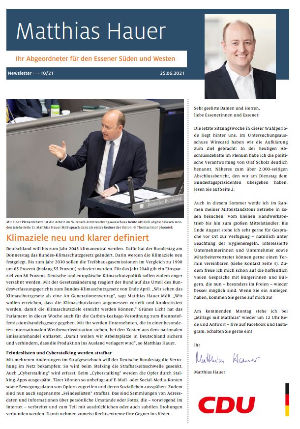 Sehr geehrte Damen und Herren, liebe Essenerinnen und Essener! Der Wirecard-Untersuchungsausschuss hat in dieser Woche mit der Vernehmung der politischen Spitzen seinen Höhepunkt erreicht. Mit acht Vernehmungstagen in den zurückliegenden zwei Wochen endete der wesentliche Teil der Beweisaufnahme.