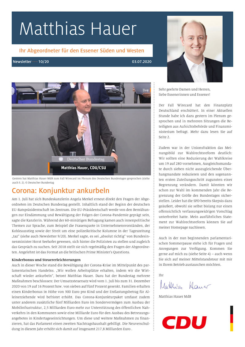 Der Fall Wirecard hat den Finanzplatz Deutschland erschüttert. In einer Aktuellen Stunde habe ich dazu gestern im Plenum gesprochen und in mehreren Sitzungen die Beteiligten aus Aufsichtsbehörde und Finanzministerium befragt. Mehr dazu lesen Sie auf Seite 2.