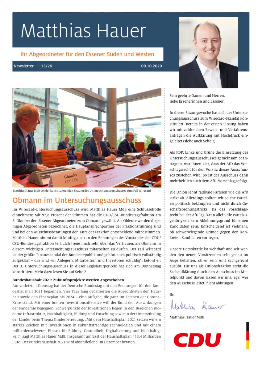 In dieser Woche hat das Parlament den Untersuchungsausschuss zum Wirecard-Skandal eingesetzt. Matthias Hauer MdB kommt dabei eine Schlüsselrolle zu – der Essener Politiker ist in der Unionsfraktion als Obmann für diesen Ausschuss gewählt worden.
