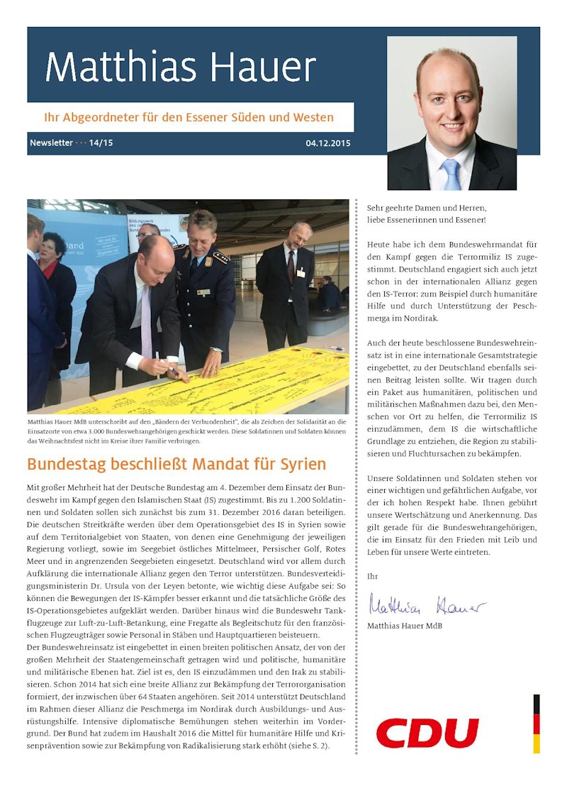 Heute habe ich dem Bundeswehrmandat für den Kampf gegen die Terrormiliz IS zugestimmt. Deutschland engagiert sich auch jetzt schon in der internationalen Allianz gegen den IS-Terror: zum Beispiel durch humanitäre Hilfe und durch Unterstützung der Peschmerga im Nordirak.