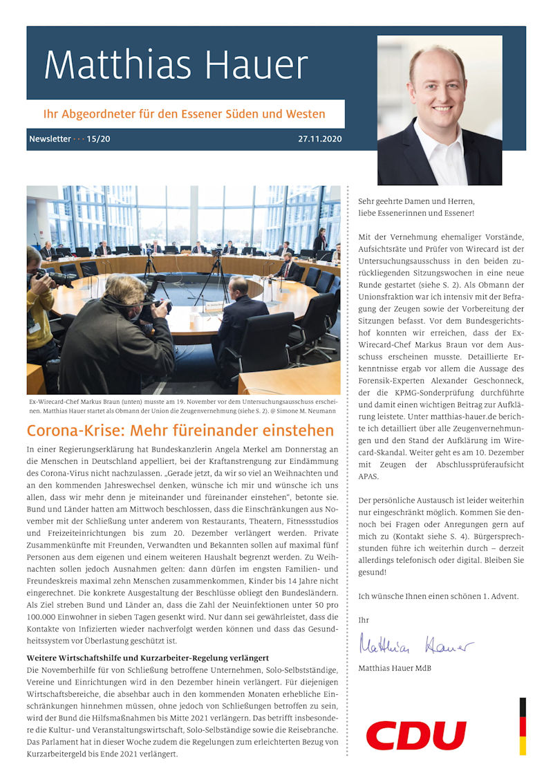 Mit der Vernehmung ehemaliger Vorstände, Aufsichtsräte und Prüfer von Wirecard ist der Untersuchungsausschuss in den beiden zurückliegenden Sitzungswochen in eine neue Runde gestartet (siehe S. 2). Als Obmann der Unionsfraktion war ich intensiv mit der Befragung der Zeugen sowie der Vorbereitung der Sitzungen befasst. Vor dem Bundesgerichtshof konnten wir erreichen, dass der Ex-Wirecard-Chef Markus Braun vor dem Ausschuss erscheinen musste. Detaillierte Erkenntnisse ergab vor allem die Aussage des Forensik-Experten Alexander Geschonneck, der die KPMG-Sonderprüfung durchführte und damit einen wichtigen Beitrag zur Aufklärung leistete. Unter matthias-hauer.de berichte ich detailliert über alle Zeugenvernehmungen und den Stand der Aufklärung im Wirecard-Skandal. Weiter geht es am 10. Dezember mit Zeugen der Abschlussprüferaufsicht APAS.