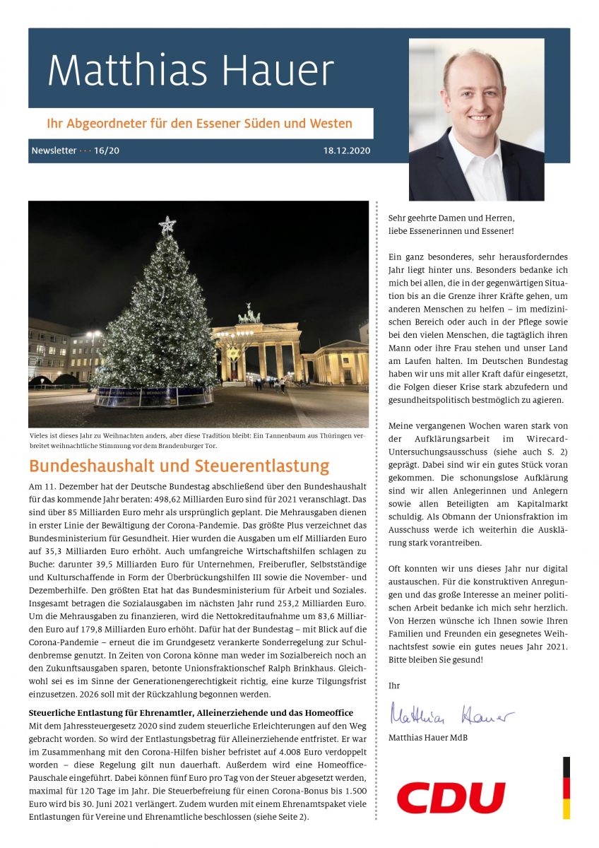 Mehr dazu und zu weiteren Neuigkeiten aus Essen und Berlin erfahren Sie im anliegenden Newsletter von Matthias Hauer MdB.