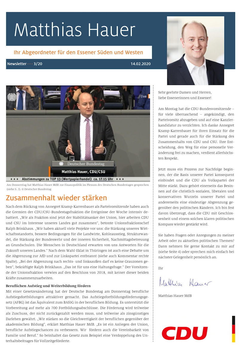 Am Montag hat die CDU-Bundesvorsitzende – für viele überraschend – angekündigt, den Parteivorsitz abzugeben und auf eine Kanzlerkandidatur zu verzichten. Ich danke Annegret Kramp-Karrenbauer für ihren Einsatz für die Partei und gerade auch für die Stärkung des Zusammenhalts von CDU und CSU. Ihre Entscheidung, den Weg für eine personelle Veränderung frei zu machen, verdient allerhöchsten Respekt.