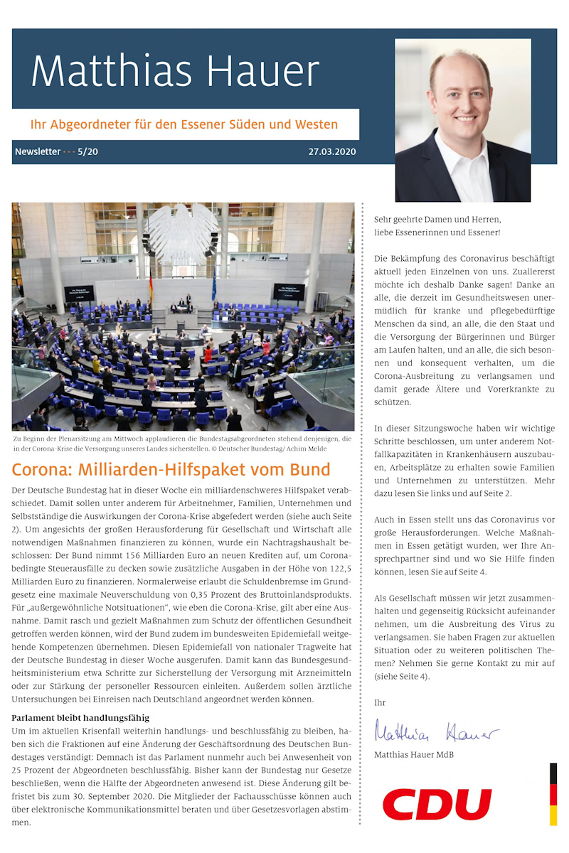 In dieser Sitzungswoche haben wir wichtige Schritte beschlossen, um unter anderem Notfallkapazitäten in Krankenhäusern auszubauen, Arbeitsplätze zu erhalten sowie Familien und Unternehmen zu unterstützen. Mehr dazu lesen Sie links und auf Seite 2.