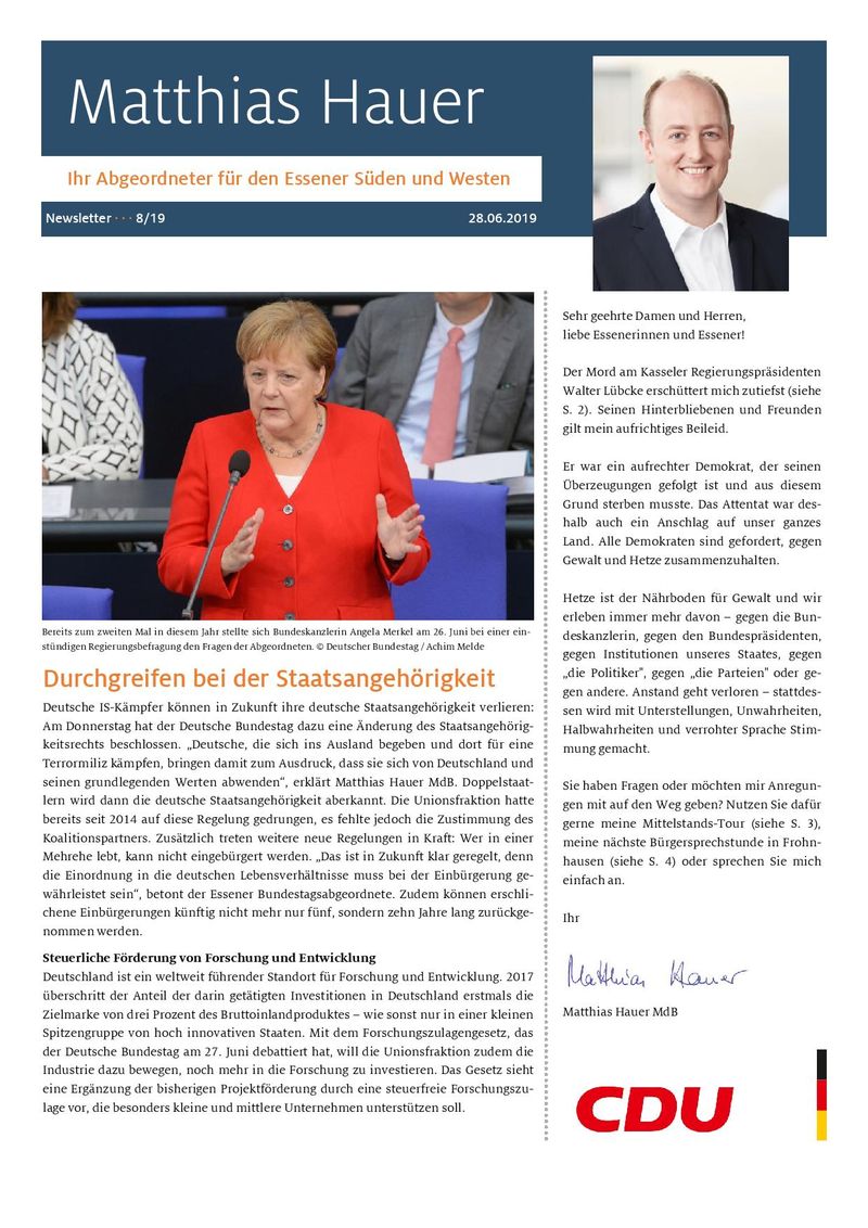 Der Mord am Kasseler Regierungspräsidenten Walter Lübcke erschüttert mich zutiefst (siehe S. 2). Seinen Hinterbliebenen und Freunden gilt mein aufrichtiges Beileid.