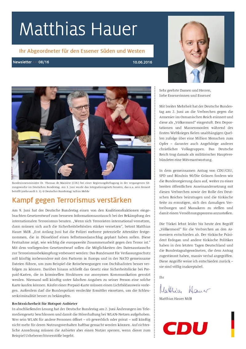 Newsletter 2016-08 Matthias Hauer MdB
