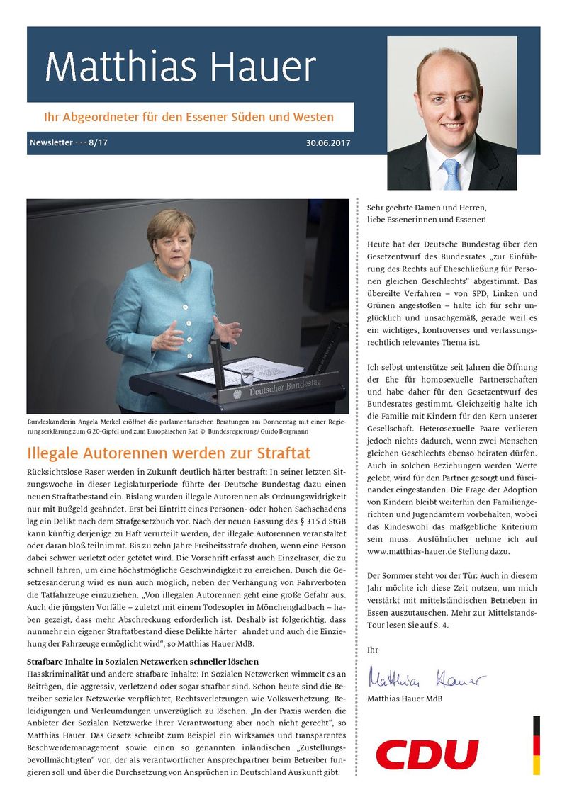 Heute hat der Deutsche Bundestag über den Gesetzentwurf des Bundesrates „zur Einführung des Rechts auf Eheschließung für Personen gleichen Geschlechts“ abgestimmt. Das übereilte Verfahren – von SPD, Linken und Grünen angestoßen – halte ich für sehr unglücklich und unsachgemäß, gerade weil es ein wichtiges, kontroverses und verfassungsrechtlich relevantes Thema ist.