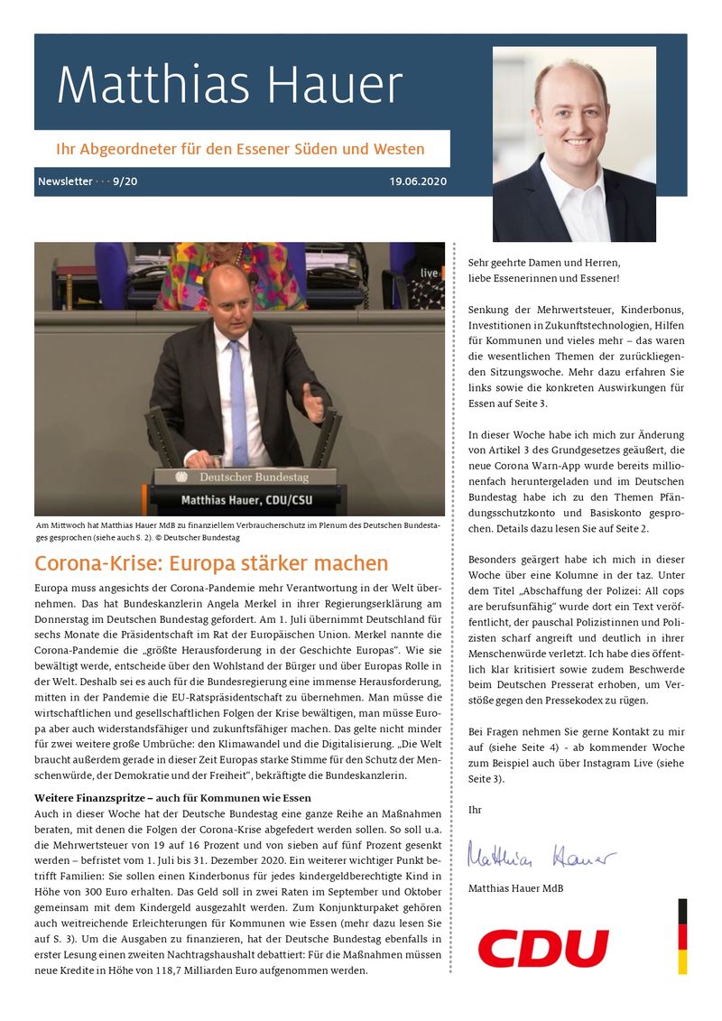 Senkung der Mehrwertsteuer, Kinderbonus, Investitionen in Zukunftstechnologien, Hilfen für Kommunen und vieles mehr – das waren die wesentlichen Themen der zurückliegenden Sitzungswoche. Mehr dazu erfahren Sie links sowie die konkreten Auswirkungen für Essen auf Seite 3.
