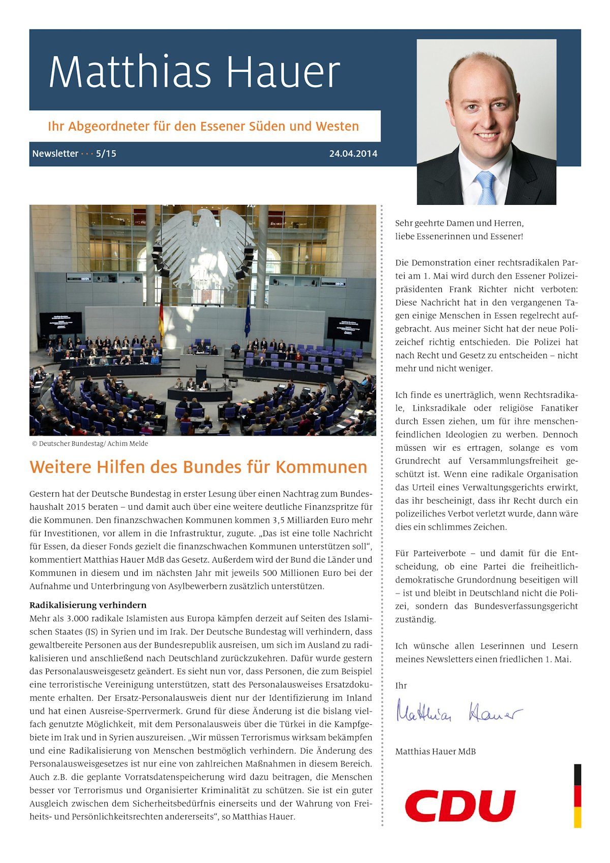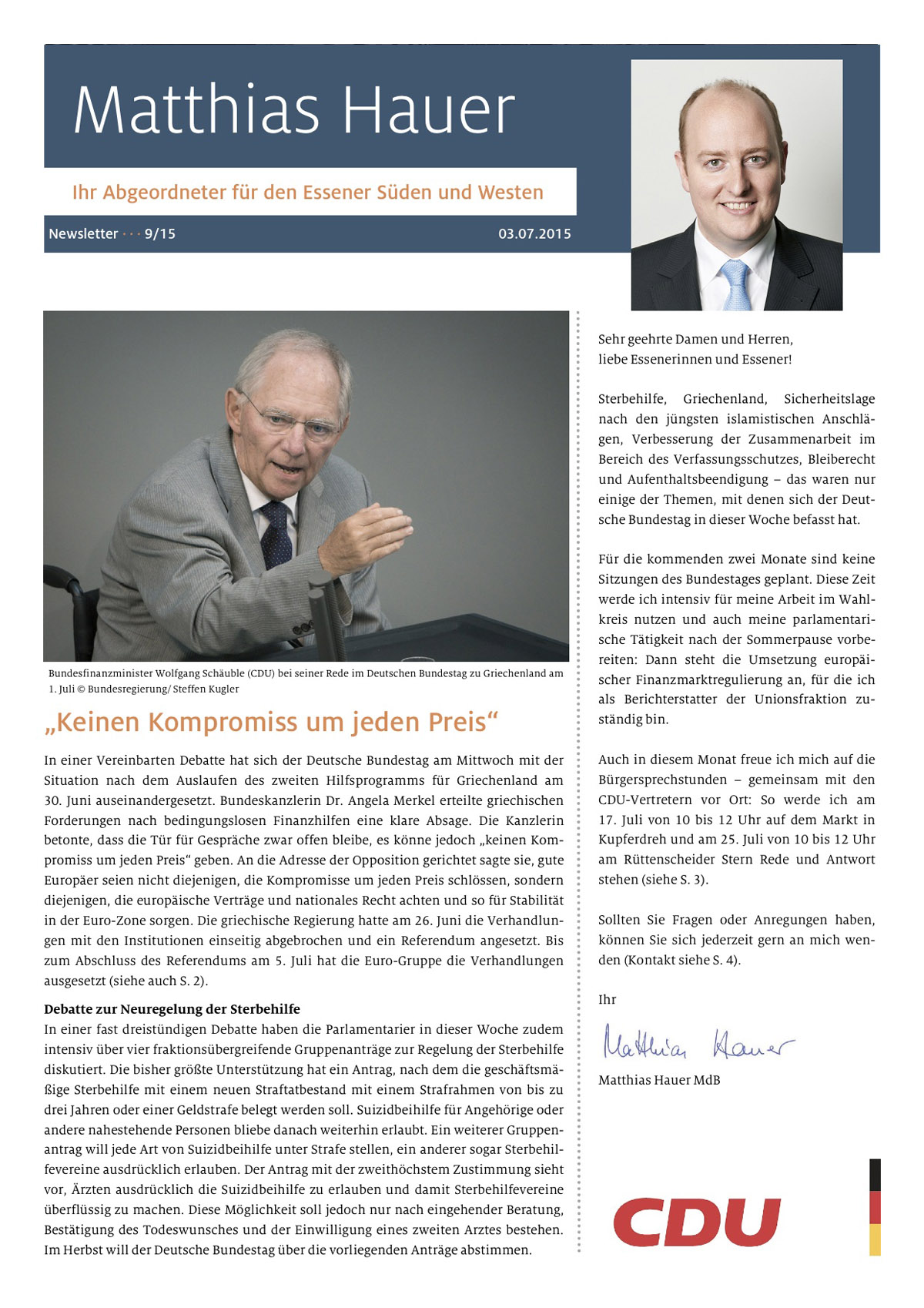 Sehr geehrte Damen und Herren, liebe Essenerinnen und Essener! Sterbehilfe, Griechenland, Sicherheitslage nach den jüngsten islamistischen Anschlägen, Verbesserung der Zusammenarbeit im Bereich des Verfassungsschutzes, Bleiberecht und Aufenthaltsbeendigung – das waren nur einige der Themen, mit denen sich der Deutsche Bundestag in dieser Woche befasst hat.