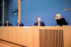 Die Abgeordneten Fritz Güntzler, Dr. Hans Michelbach und Matthias Hauer mit Journalistin Corinna Buschow (von links nach rechts) bei der Bundespressekonferenz