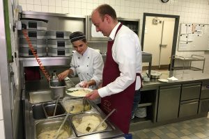 Heute gibt es Hühnerfrikassee. Matthias Hauer teilt nach Anleitung von Köchin Svenja Özen die Portionen aus.