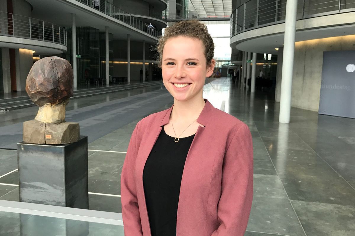 Helena Schmidt nach einer Sitzung des Finanzausschusses im Paul-Löbe-Haus im Deutschen Bundestag. Die 23-Jährige hat im Februar und März ein zweimonatiges Praktikum im Bundestagsbüro von Matthias Hauer MdB in Berlin absolviert. Sie studiert im sechsten Semester „European Studies“ mit dem Schwerpunkt Politikwissenschaft. Die gebürtige Essenerin hatte sich für das Praktikum beworben, um einen Einblick in die Praxis ihres Studiengebiets zu bekommen.