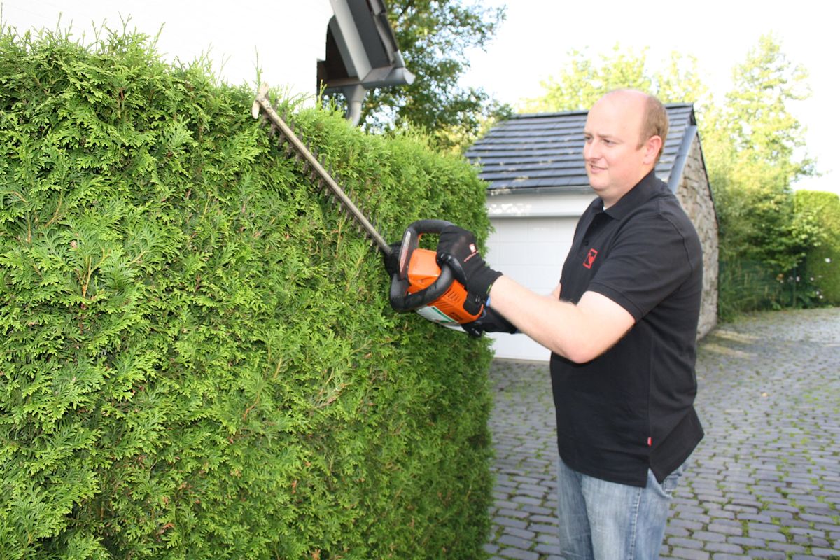 Und so ging es auch direkt an die praktische Arbeit: Unter Anleitung von Birger Bredenbrücher, Gründer und Inhaber der Bredenbrücher GbR, beschneidet Matthias Hauer eine Hecke – „möglichst leicht pyramidenartig“, wie der Profi erklärt. Im Anschluss Besuch auf einer aktuellen Baustelle: Vor einem Haus in Heisingen wird der gesamte Außenbereich erneuert: Frischer Rasen wird gelegt, neue Büsche werden gepflanzt, die Treppen und Wege mit neuen Platten verlegt. Drei Mitarbeiter der Bredenbrücher GbR sind schon vor Ort: Sie zersägen das alte Holz, bereiten den Boden für den Rollrasen vor. Matthias Hauer steigt auf den 800 Kilo schweren Minibagger, entfernt damit alte Kiefernbüsche und pflanzt dafür neue ein.