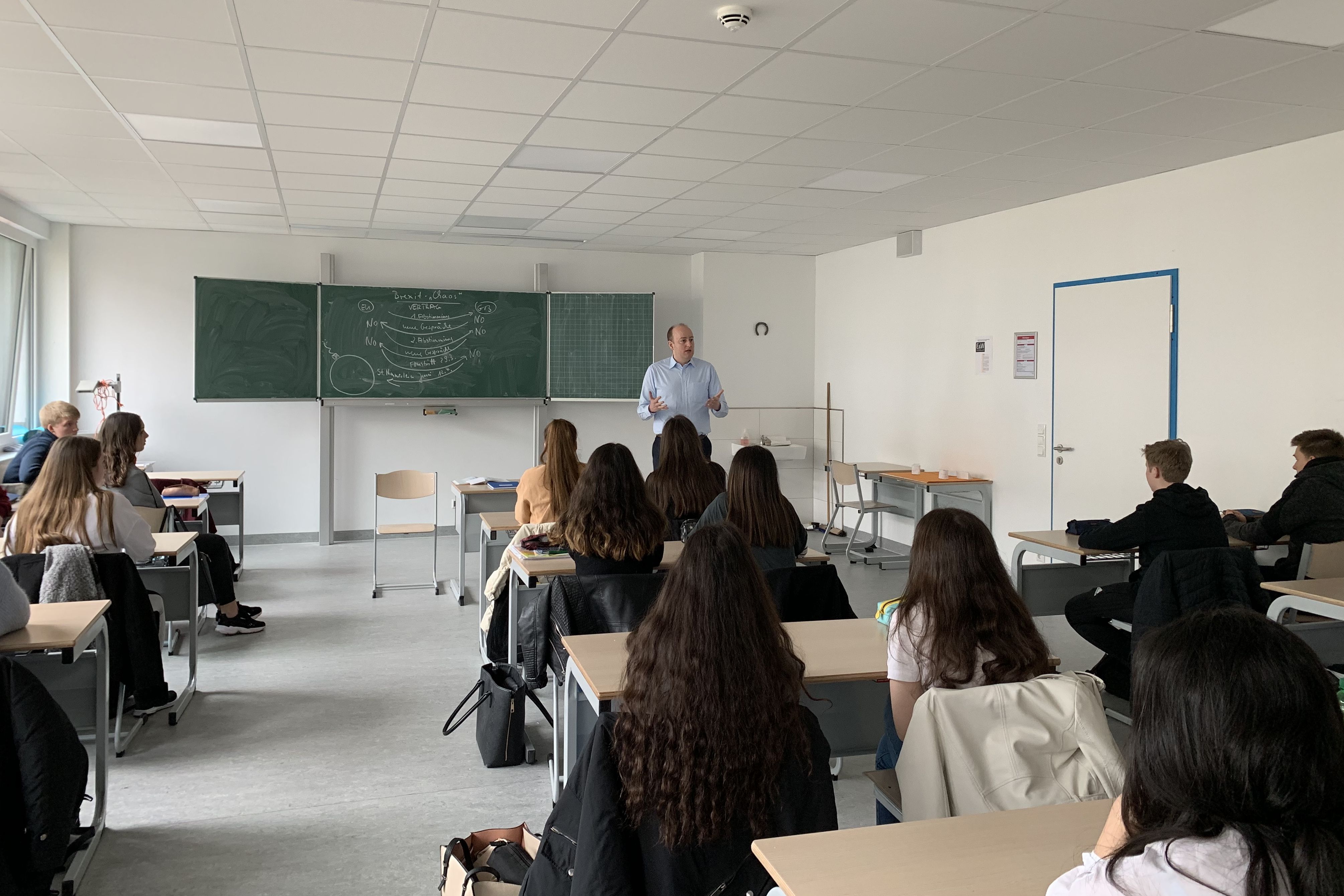 Matthias Hauer MdB diskutiert mit Schülerinnen und Schülern der Realschule Essen-West über Europa.