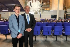 Matthias Hauer MdB mit dem Werdener Schüler Lennard Kelbch, Teilnehmer von „Jugend und Parlament“, im Plenarsaal des Deutschen Bundestages.