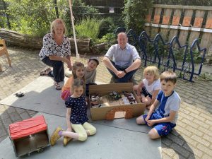 Die Kinder der Kita St. Barbara Essen Kupferdreh zeigen Matthias Hauer den selbst gebastelten Pferdestall des Reiterhofes. Im Hintergrund: Einrichtungsleiterin Martina Reinecke.