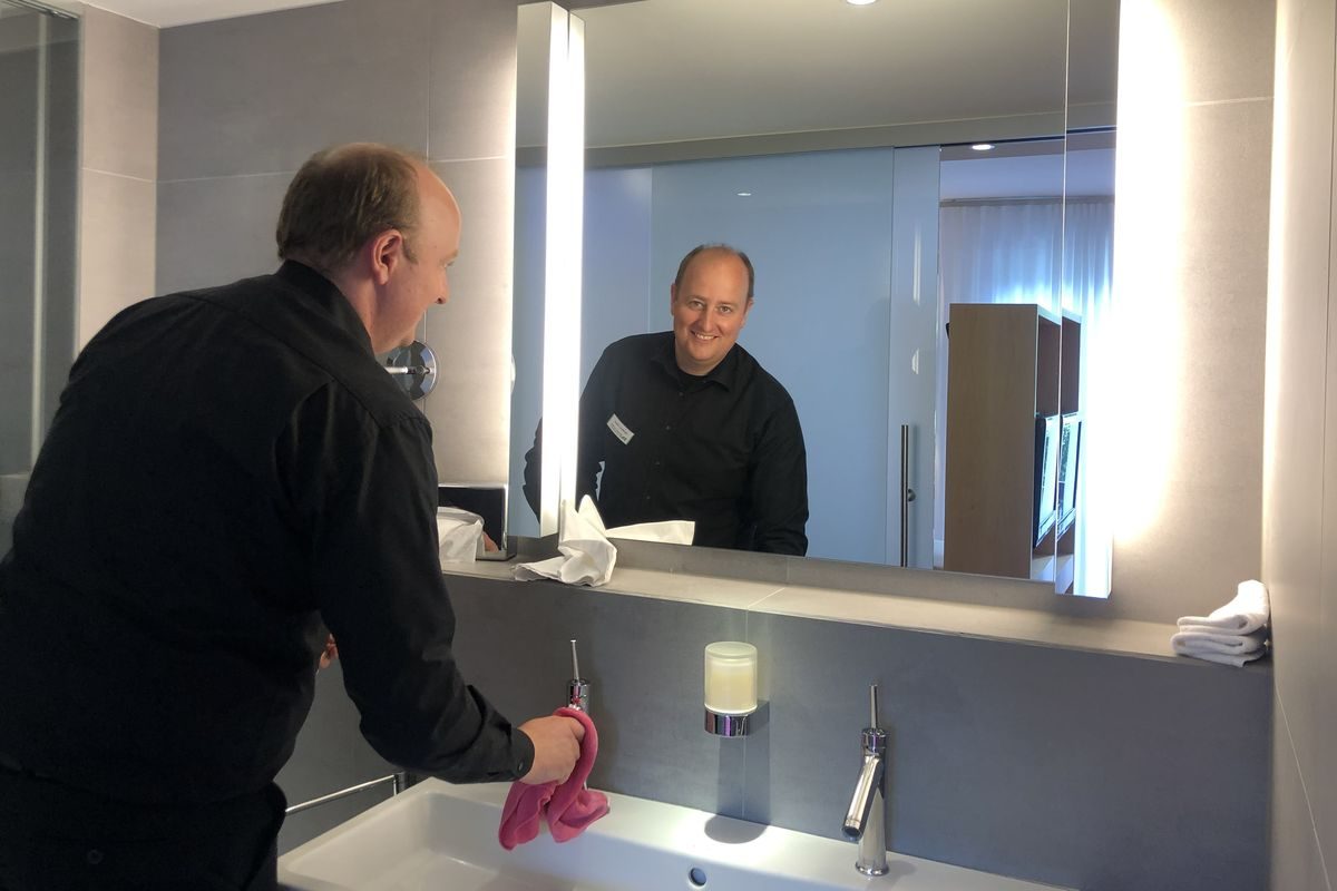 Nächster Halt: Housekeeping. Unter der fachmännischen Betreuung von Tatjana Völker lernte der Essener Bundestagsabgeordnete viele der 50 Zimmer – jeweils 25 Doppel- und 25 Einzelzimmer – des Burgaltendorfer Land Hotels kennen und packte mit Putzlappen, Staubsauger und frischer Bettwäsche bei der Zimmerreinigung mit an. „Ich arbeite seit 1996 hier im Mintrops“, betont Tatjana Völker. „Wir sind wie eine große Familie – jeder hilft jedem, vom Housekeeping bis zum Chef.“