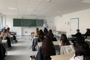 Matthias Hauer MdB stellt sich den Fragen der Schülerinnen und Schüler zu Europa. Insgesamt besuchte der Bundestagsabgeordnete drei Kurse aus den Stufen 8 und 10.