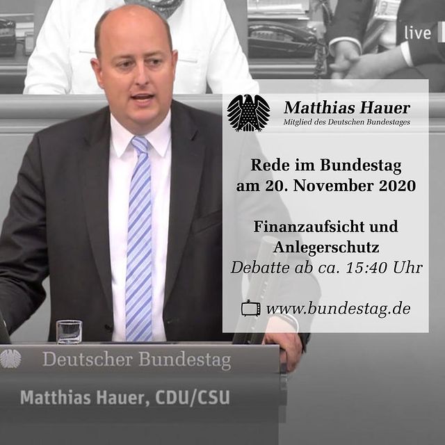 Rede von Matthias Hauer MdB am 20.11.2020 zu den Themen Finanzaufsicht und Anlegerschutz. Zur Beratung standen zwei Anträge der Fraktion BÜNDNIS 90/DIE GRÜNEN sowie zwei Anträge der Fraktion der AfD.