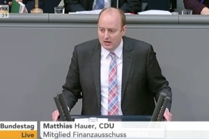 Matthias Hauer MdB bei seiner Rede zur Einbringung des Ersten Finanzmarktnovellierungsgesetzes im Deutschen Bundestag am 18. Februar. Die Debatte wurde vom Fernsehsender Phoenix sowie vom Parlamentsfernsehen live übertragen.