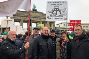 Bauernproteste am Dienstag: Wolfgang Berns aus Mintard, Thomas Leuchten aus Heidhausen und Benedikt Kaschinski sowie Annette und Einhart Im Brahm aus Kettwig trafen Matthias Hauer in Berlin (v.l.).