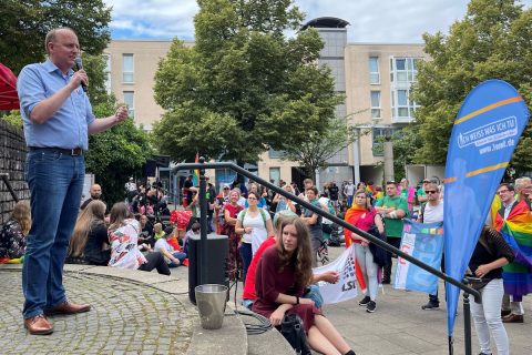 Matthias Hauer erläutert seine Positionen zu wichtigen Themen aus der LGBTIQ-Community am Weberplatz.
