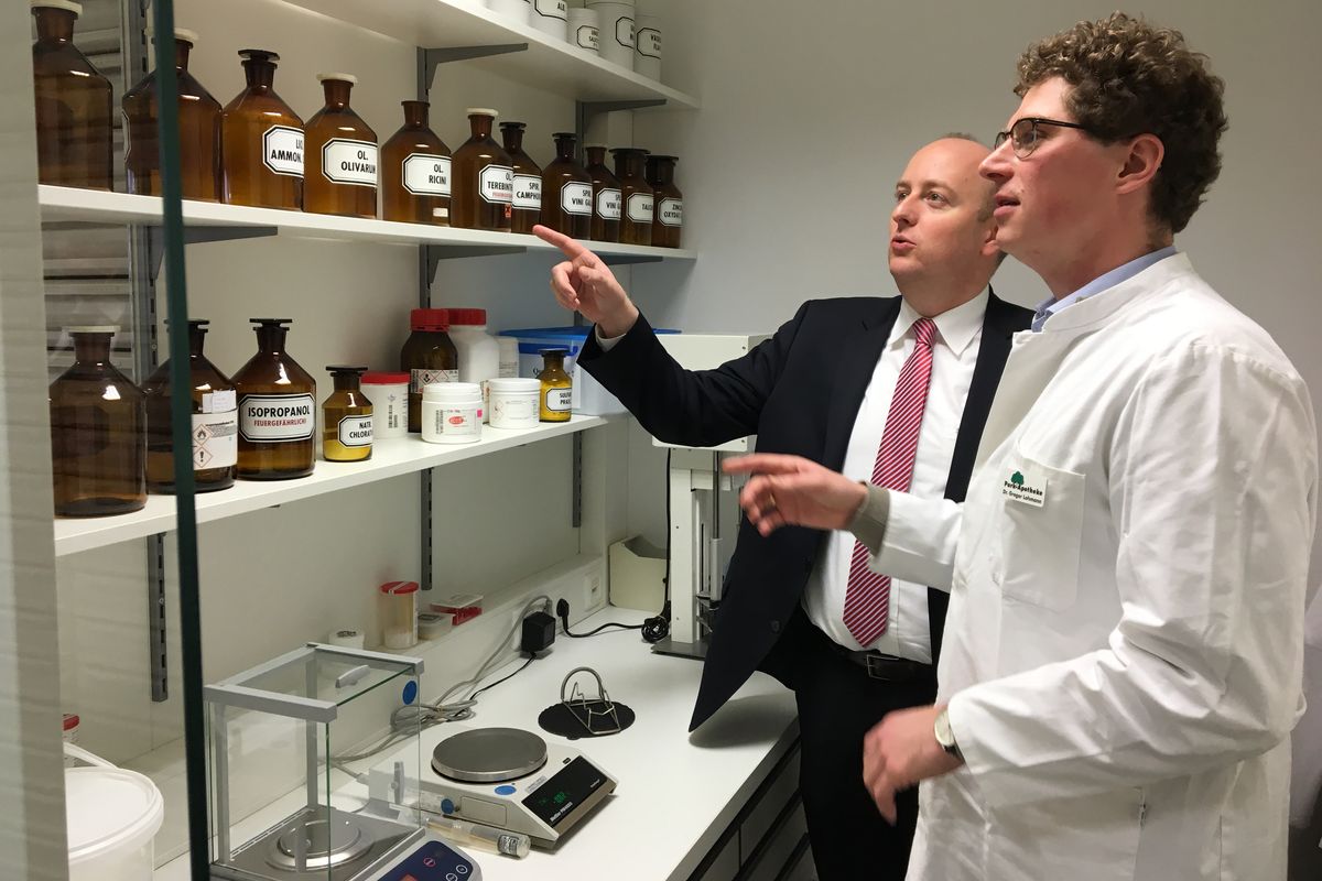 Apotheker Jan Bas zeigt den Abgeordneten Dr. Georg Kippels und Matthias Hauer die Apotheke vor Ort.