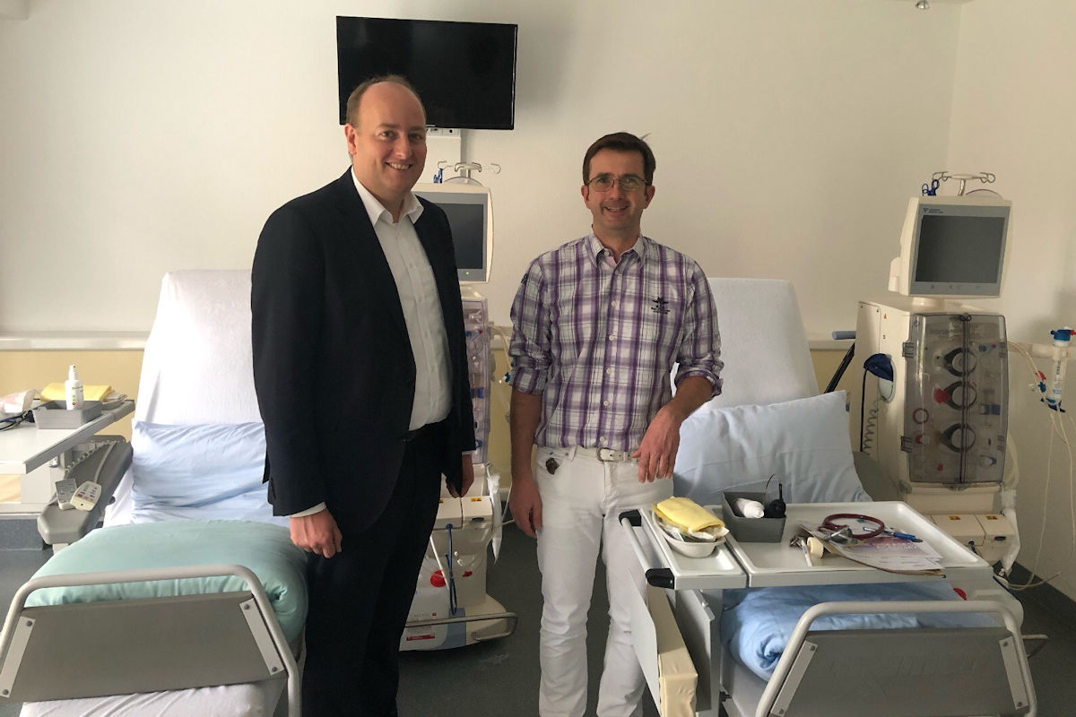 Derzeit diskutiert der Deutsche Bundestag über mehrere Gesetzentwürfe zum Thema Organspende. Mit dem Essener Nierenarzt Martin Lesch hat sich Matthias Hauer MdB am 1. Oktober dazu in dessen Steeler Gemeinschaftspraxis für Nephrologie zum Gespräch getroffen. Im Fokus des Austauschs standen neben den aktuellen Gesetzentwürfen auch die Diagnose und Therapie von Nierenerkrankungen. „Mir ist es wichtig, in meine Entscheidungen in Berlin gerade auch die Erfahrungen einfließen zu lassen, die ich hier vor Ort in Essen mache. Dazu dienen auch solche Gespräche wie mit Martin Lesch“, sagt Matthias Hauer. „Vielen Dank für den interessanten Austausch!“