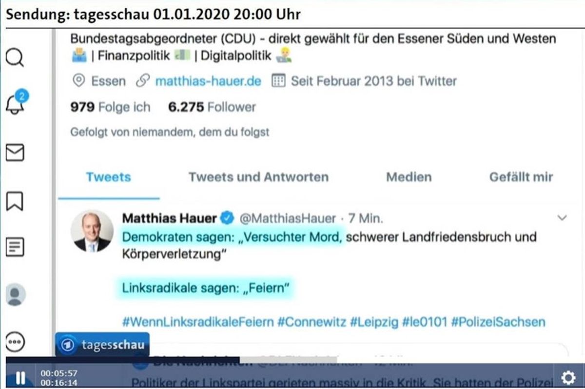 Matthias Hauer MdB hat sich über die Ereignisse in der Silvesternacht in Leipzig deutlich geäußert. Bei Ausschreitungen zwischen Linksautonomen und der Polizei wurde unter anderen ein Beamter schwer verletzt. „Dem 38-jährigen Polizisten ist der Helm vom Kopf gerissen worden und er wurde brutal attackiert. Laut Staatsanwaltschaft wurde dabei sogar dessen Tod billigend in Kauf genommen“, erklärt Matthias Hauer. „Es ist unfassbar, wenn linke Politiker diese linksradikalen Gewalttäter als ‚Feiernde‘ verharmlosen. Hier handelt es sich um versuchten Mord.“ Mit seinen klaren Aussagen wurde der Essener Bundestagsabgeordnete auch in der Tagesschau (Bild links) und weiteren Medien zitiert. „Wir brauchen über alle Parteigrenzen hinweg – wie beim Rechtsextremismus – auch eine klare Verurteilung des Linksextremismus“, betont er.
