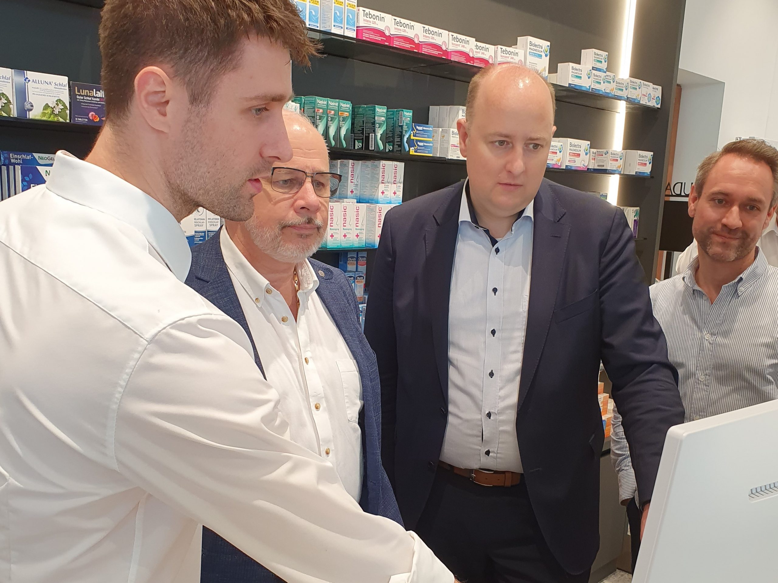 Apotheker Jan Bas zeigt den Abgeordneten Dr. Georg Kippels und Matthias Hauer die Apotheke vor Ort.