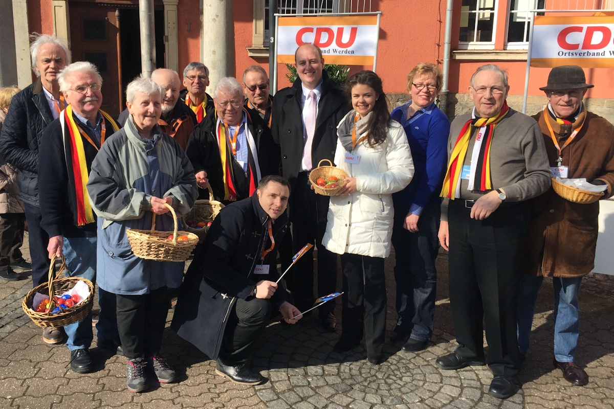 Am Karsamstag hat Matthias Hauer MdB die CDU Werden bei ihrem alljährlichen Oster-Infostand unterstützt. 1.217 Ostereier – entsprechend dem Alter von Werden – wurden vor dem dortigen Rathaus verschenkt. Vor allem der Austausch mit den Werdenerinnen und Werdenern stand für den Bundestagsabgeordneten sowie die Werdener CDU im Mittelpunkt der Aktion. Neben Matthias Hauer MdB beteiligten sich unter anderem auch der Vorsitzende der CDU Werden und Bezirksvertreter Hanslothar Kranz, Ratsfrau Martina Schürmann sowie Bezirksvertreter Herbert Schermuly an der Aktion. Viele Passantinnen und Passanten nutzten die Gelegenheit zum Austausch über bundespolitische und Werdener Themen.